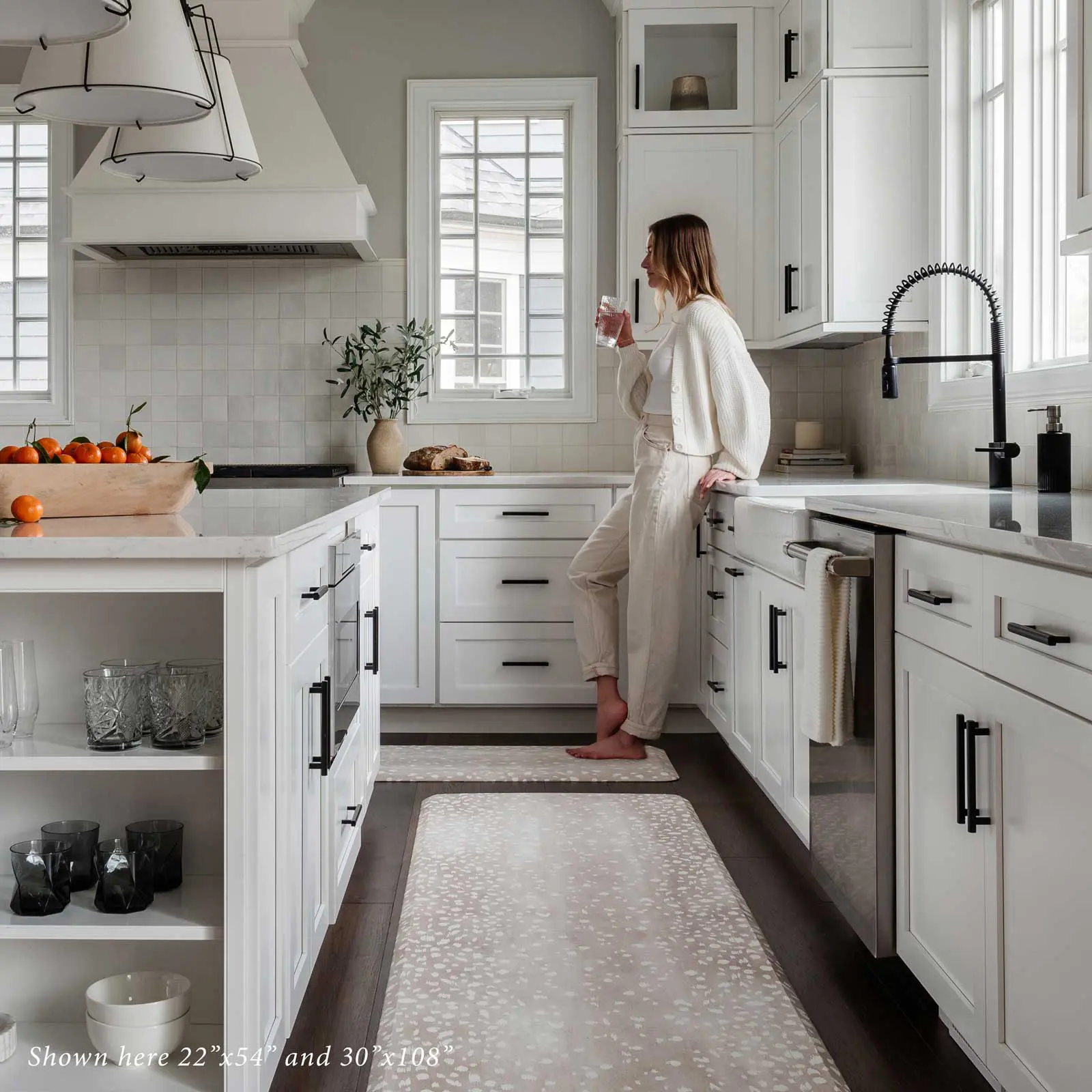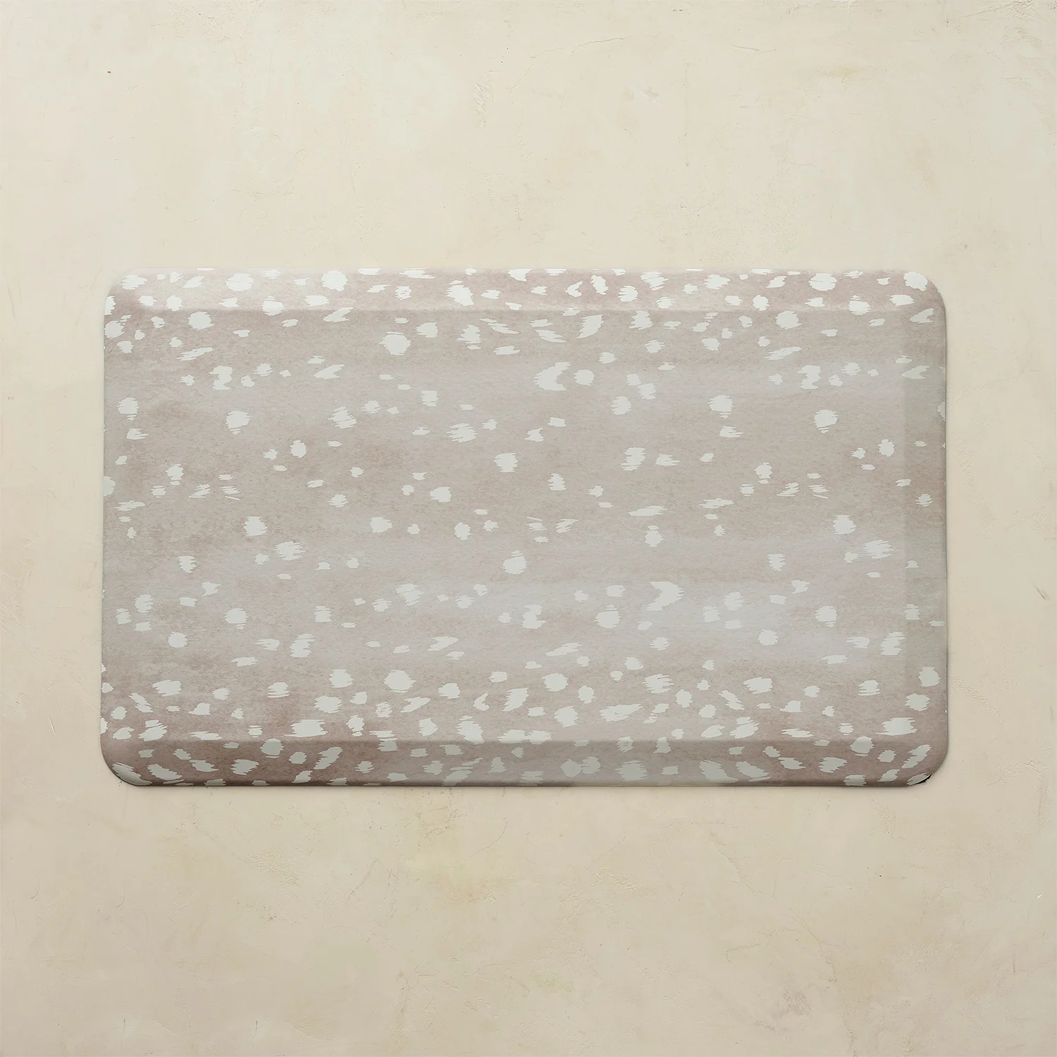 Feature Details Product Name Nama Standing Mat Fawn Type Anti-Fatigue Standing Mat Material High-density ergonomic foam Thickness 3/4 inch Surface Printed wipe-clean top Backing Anti-slip base Design Nature-inspired hand-painted spots Sizes Available 22×36, 22×54, 22×72, 30×72, 30×108 Suitable For Kitchen, office, laundry, standing desks