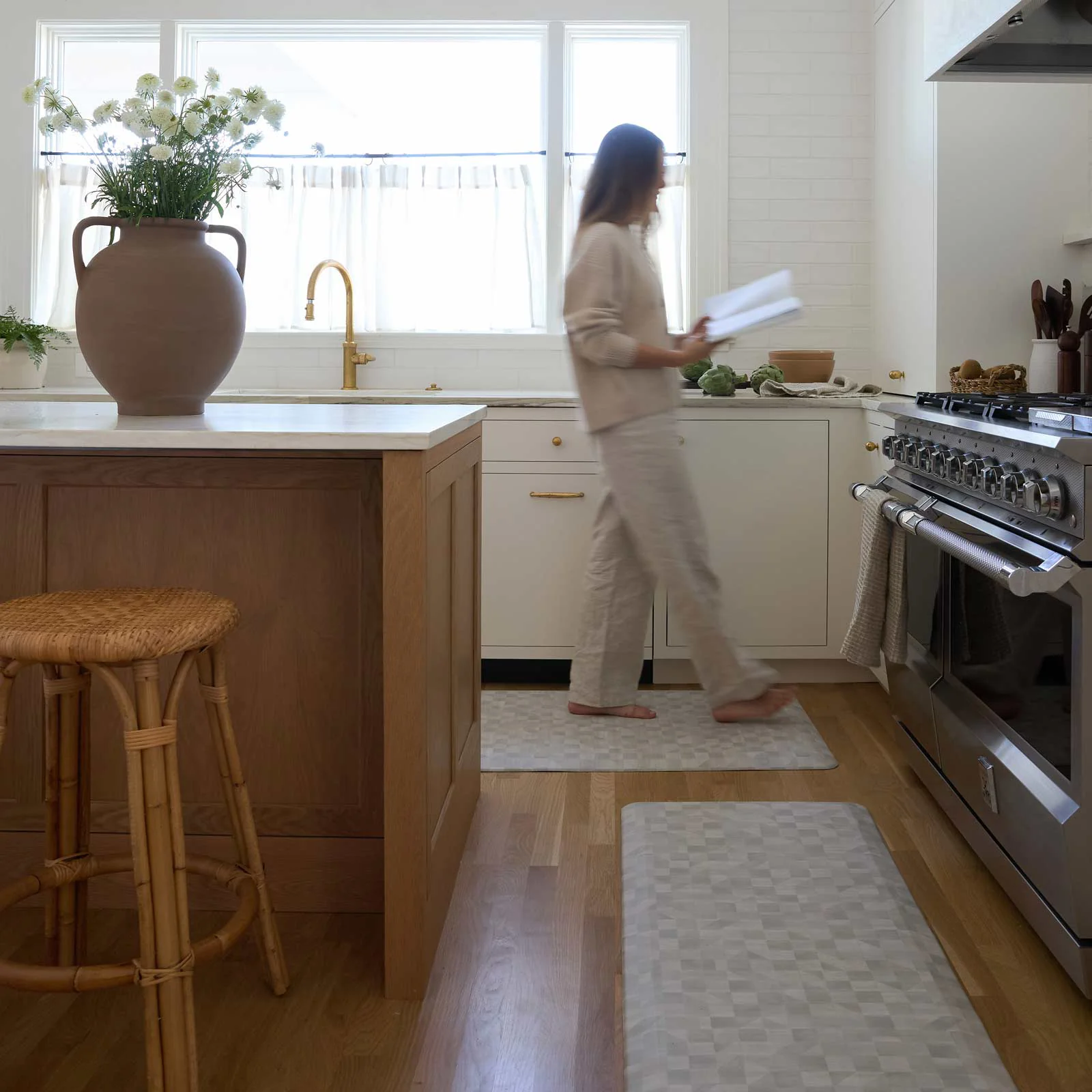 Feature Details Product Name Nama Standing Mat Georgia Type Anti-Fatigue Standing Mat Material High-density ergonomic foam Thickness 3/4 inch Surface Printed fabric top, wipe-clean Backing Anti-slip base Design Modern check pattern Sizes Available 22×36, 22×54, 22×72, 30×72, 30×108 Suitable For Kitchen, office, laundry, standing desks